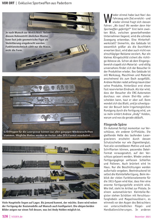Fast alle vorstellbaren Motive und auch Schriftarten können, passendes Datei-Format vorausgesetzt, auf den Verschluss gelasert werden. Wieder andere Fertigungsgänge umfassen Schleifen und Polieren. Auch brüniert wird im Haus. Nur die Beschichtungen werden außerhalb vergeben. Beeindruckend ist selbst die Kleinteilefertigung. Beim Anblick der vielen Funktionselemente für die 1911-Typen wird klar, dass hier eine enorme Fertigungstiefe erreicht wird.