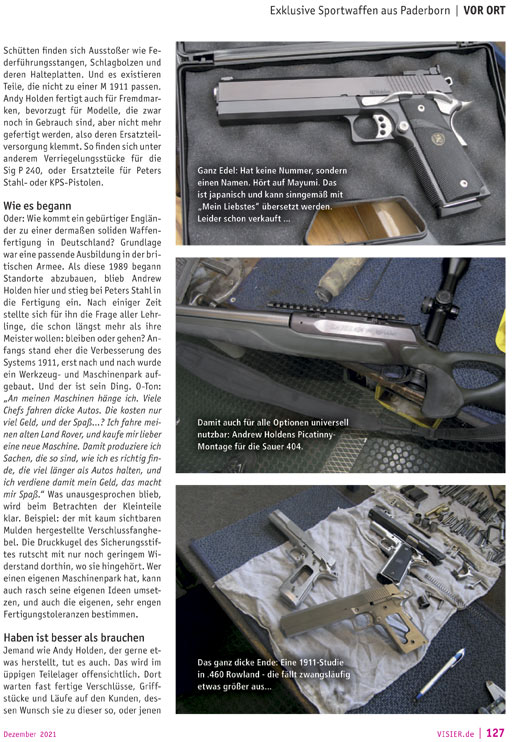 Oder: Wie kommt ein gebürtiger Engländer zu einer dermaßen soliden Waffenfertigung in Deutschland? Grundlage war eine passende Ausbildung in der britischen Armee. Als diese 1989 begann Standorte abzubauen, blieb Andrew Holden hier und stieg bei Peters Stahl in die Fertigung ein. Nach einiger Zeit
